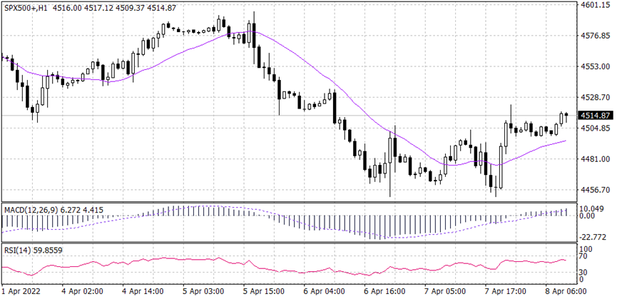 الاتجاه العام لمؤشر S&P 500 من الإطار الزمني اليومي صعودي. وكذلك من الإطار الزمني لكل ساعة، يبدو أن السعر قد كسر النمط السابق في الاتجاه الصعودي ومن المرجح أن يعيد الاختبار حول المستوى 4500 وإعادة اختبار محتملة للمتوسط المتحرك لـ 20 فترة قبل الاستمرار في الاتجاه الصعودي. يشير كلا من مؤشر القوة النسبية RSI وMACD إلى استمرار السعر في الاتجاه الصعودي.