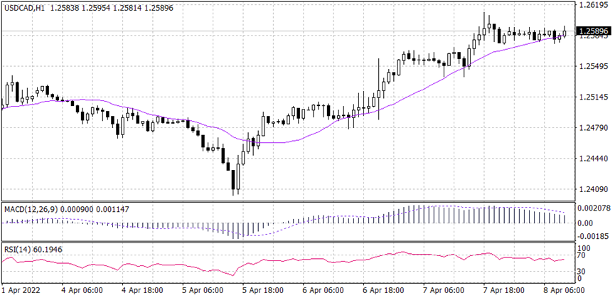 يتحرك زوج الدولار الكندي في اتجاه أفقي. مع ذلك، من الإطار الزمني للساعة يبدو أن السعر صعودي ويعيد اختبار المستوى 1.2575 الذي له تقاطع محتمل مع المتوسط المتحرك لفترتين. يقع MACD وRSI فوق خط الوسط مما يشير إلى استمرار السعر في الاتجاه الصعودي.