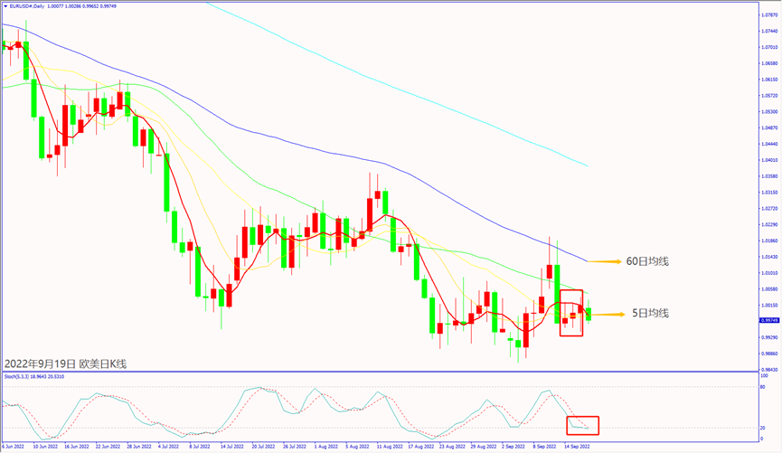 日级别线图,近3天在1.0000关口附近震荡,一旦突破5日均线,可能上看60日均线。