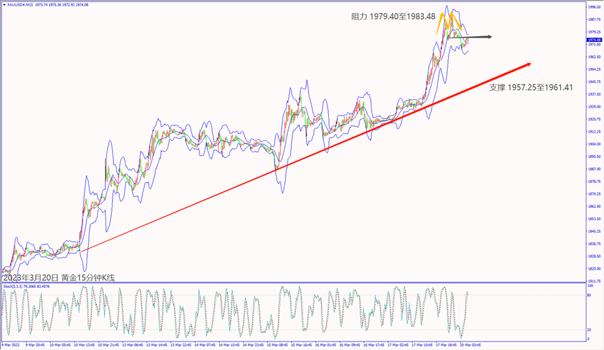 上周五(17日)市场担忧瑞信问题利淡股指下跌,以及美国公布一年期通胀率预期下降利淡美元,带动黄金价格大涨约70美元,尾盘守在1980.00关口附近震荡。预期今天(20日)欧洲央行行长拉加德重申持续加息抑制通胀利好欧元和利淡美元,黄金价格若守住小时布林带下轨线1960美元,建议可短多操作。
