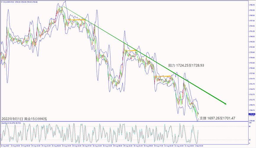 日级别线图,连续下跌KD空方背离,守住1700.00关口,有望止跌反弹;15分钟K线,短线形成盘跌,一旦突破下降趋势线,不排除挑战前高阻力。