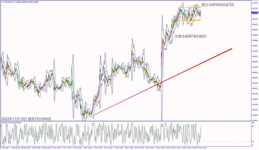 今天(15日)澳洲联储对未来加息表示不明利淡澳元,澳美一旦跌破小时布林带下轨线0.6675,建议可短空操作。预期今天欧元区公布第三季度GDP修正值利好欧元,欧美若守住小时布林带下轨线1.0296,建议可短多操作。预期今天美国公布PPI数据下降利淡美元,镑美若突破120日均线1.1760,建议可短多操作。