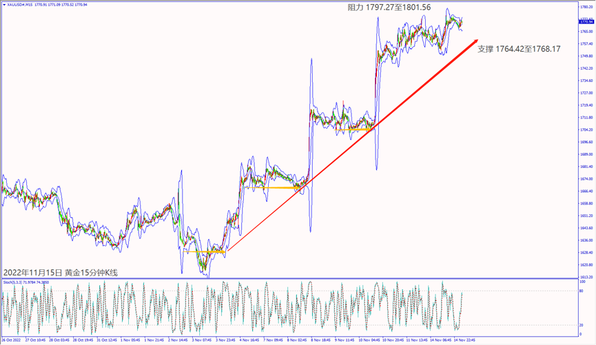 昨天(14日)美联储预期放缓加息步伐利淡美元,带动黄金价格上涨约22美元,尾盘守在1770.00关口上方整理。预期今天(15日)美国公布PPI数据利淡美元,黄金价格若守住小时布林带下轨线1765美元,建议可短多操作。