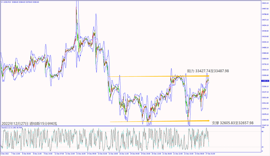 上周五(23日)美国公布消费者信心指数利好,以及美国公布一年期通胀预期下降利淡加息,带动道琼斯和纳指逆势涨近1%。预期今天(27日)欧央官员重申加息抑制通胀,德指若跌破小时布林带中轨14,016,建议可短空操作。预期今天美国公布经济大都不佳,道琼斯冲不过小时布林带上轨线33,480,建议可短空操作。