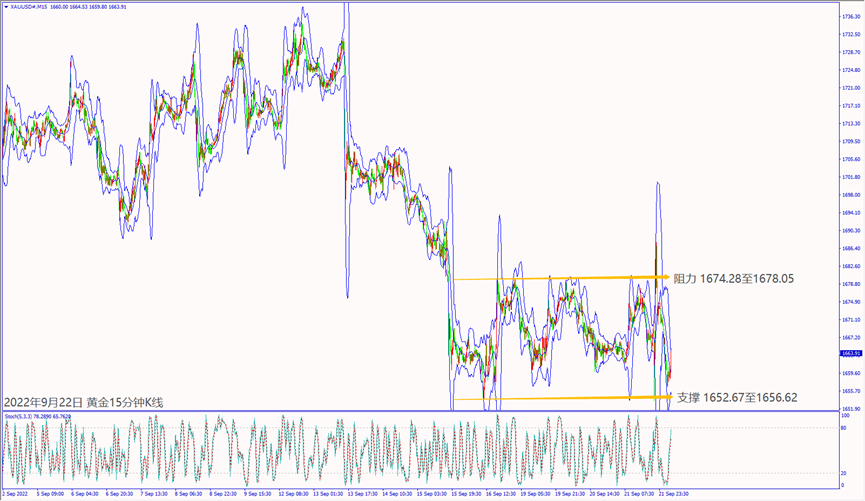 日级别线图,近期在1650美元上方盘整,一旦突破5日均线,有望形成反弹;15分钟K线,短线区间震荡,守住盘整底部,大有可能挑战上方阻力。