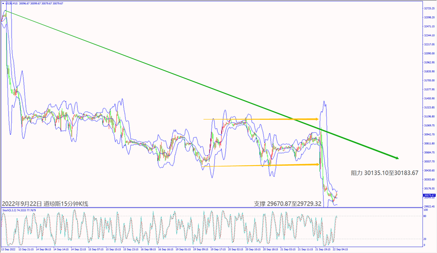 今天(22日)清晨美联储利率决议宣布加息,点阵图预测今年至少再加息3码,造成欧美股指反转大跌逾2%。预期今天瑞士和英国央行利率决议宣布加息,德指冲不过小时布林带中轨12,563,建议可偏空操作。预期今天美国公布经济数据好坏参半,道琼斯冲不过小时布林带中轨30,194,建议可偏空操作。