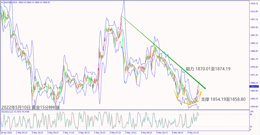 昨天(9日)美元指数再创20年新高,造成黄金价格大跌近30美元。预期今天(10日)美国财长耶伦在金融稳定报告证词对经济提出示警,一旦造成美元和美股下跌,推升黄金价格突破小时布林带上轨线1862美元,建议可短多操作。