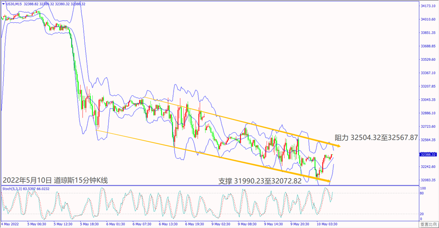 昨天(9日)美国经济数据利淡,以及美联储预期多次加息,造成道琼斯和纳指再创波段新低。预期今天(10日)欧元区公布经济数据利好,德指冲不过小时布林带上轨线13,476,建议可偏空操作。预期今天美国财长对经济增长提出示警,道琼斯冲不过小时布林带上轨线32,485,建议可偏空操作。