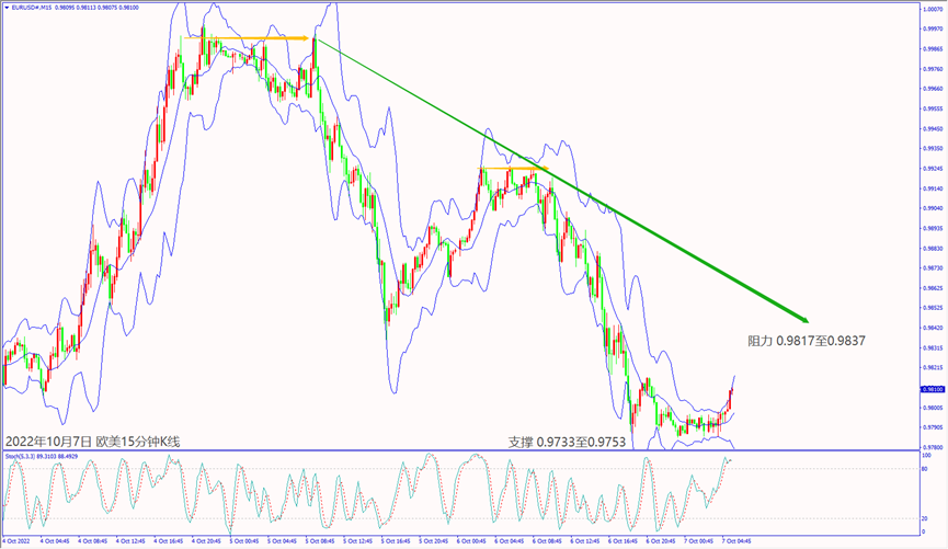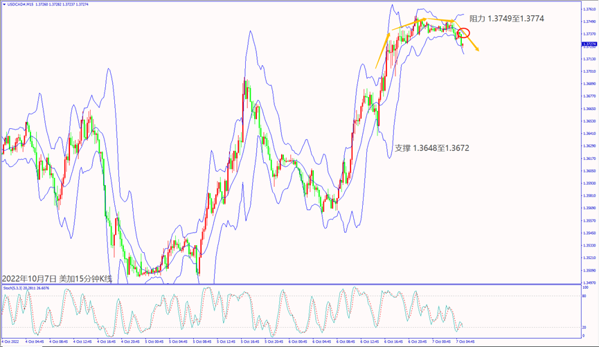 日级别线图,反弹触及10月3日起跌阻力,一旦跌破1.3700关口,可能再度下跌;15分钟K线,圆形顶反转,反弹冲不过布林带中轨,不排除回测前低支撑。