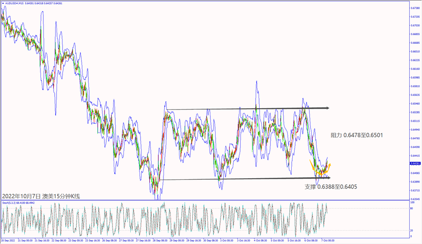 日级别线图,近期在0.6400关口附近盘底,一旦突破5日均线,有望启动涨势;15分钟K线,短线区间震荡,守住盘整底部,有机会挑战起跌阻力。