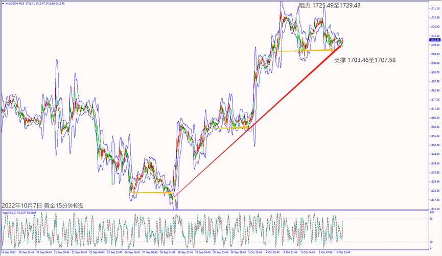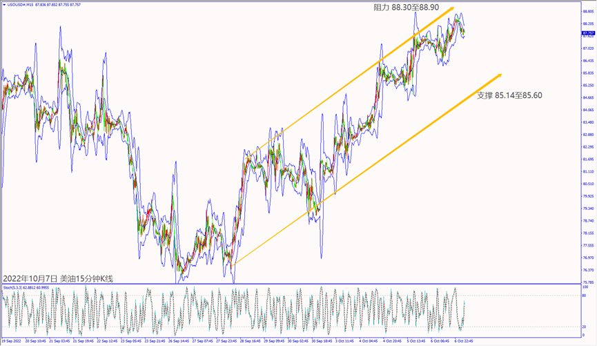 昨天(6日)市场对欧佩克+在11月减产200万桶/日,加上欧洲对俄罗斯原油进口的禁令表示利好油价,带动美油价格涨逾2%,尾盘守在88.00关口上方整理。预期今天(7日)欧美公布经济数据好坏参半,美油价格一旦跌破小时布林带下轨线87.11美元,建议可短空操作。