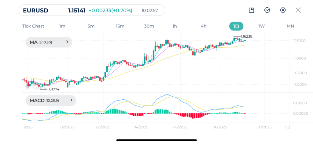 欧元/美元日线图呈现明显上升趋势,但近期动能有所放缓。预计价格将回调至30日均线后重拾升势,若突破近期高点1.1630,则有望进一步上探1.1700关口。