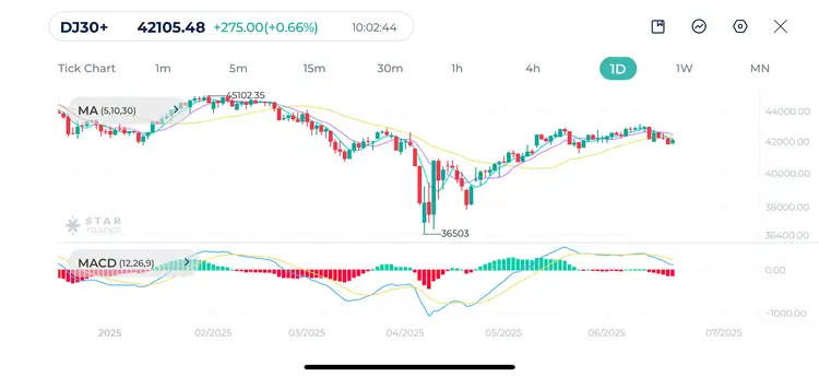 道琼斯指数日线图形成双顶形态后,价格自43,118高点显著回落超3%。5日与10日均线相继下穿30日均线形成死叉,且价格跌破30日均线支撑,显示强烈看跌修正信号。