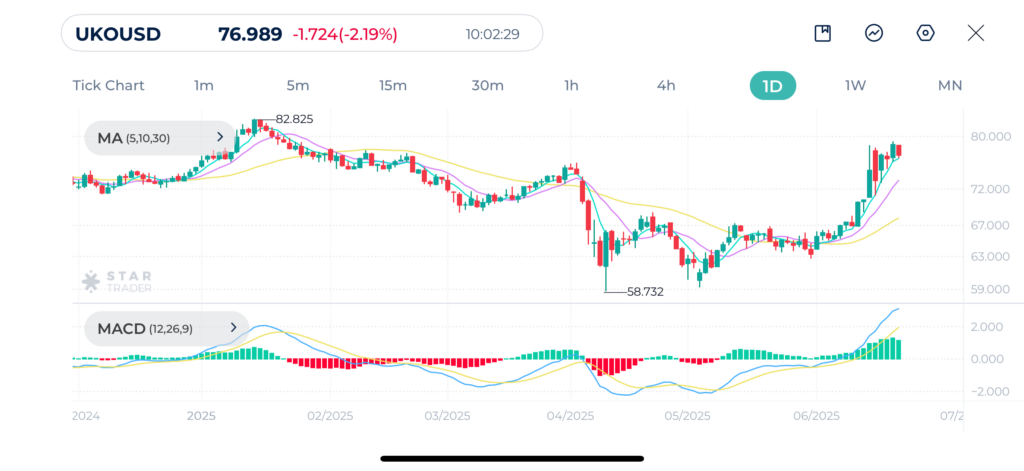 油价日线图显示强劲多头趋势,但当前在78美元附近遭遇强阻力。若无法有效突破该水平,短期走势偏空,可能面临回调。