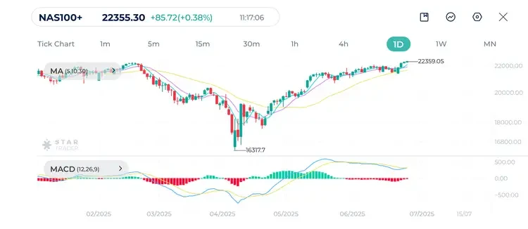 本周美股指数大幅走高,整体多头趋势依旧强劲。纳斯达克指数(Nasdaq)日线图显示出典型的“高点抬高 + 低点抬高”结构,技术上明确处于上涨趋势中。