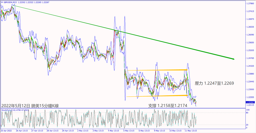 日級別線圖,長上影線黑K再創波段新低,移動均線空方排列,可能延續跌勢;15分鐘K線,跌破盤整底部,反彈沖不過該壓力,大有可能下探支撐。