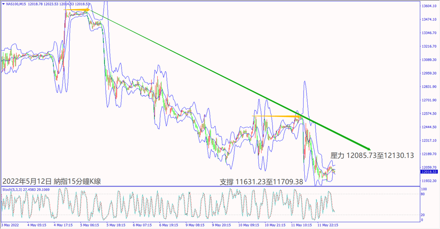 昨天(11日)美國公佈通脹數據下降但高於市場預期,美國總統拜登暗示美聯儲加息抑制通脹,造成道瓊斯和納指皆跌超600點再創波段新低。預期今天(12日)英國公佈經濟數據大都不佳,德指一旦跌破5日均線13,574,建議可偏空操作。預期今天美國公佈經濟數據不佳,納指若跌破小時布林帶下軌線11,977,建議可偏空操作。
