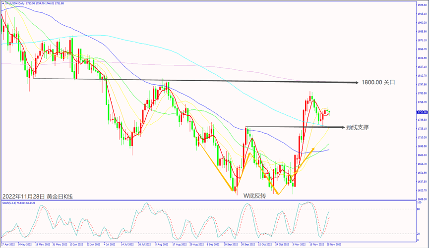 日級別線圖,W底反轉,守住頸線支撐,有望挑戰1800美元。