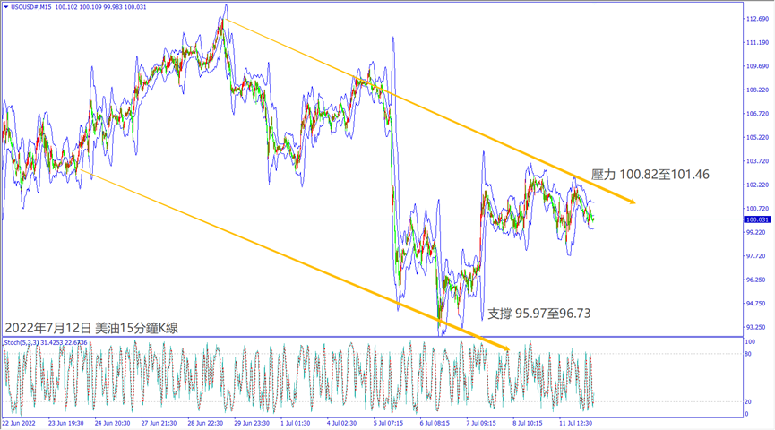 昨天(11日)德國總理再次警告能源危機,以及法國財長警告說,莫斯科很有可能完全停止對歐洲的天然氣供應,造成歐美、鎊美、澳美和紐美從早上高點下跌逾140個點皆創波段新低,推升美元指數大漲約140個點再創20年新高,帶動美日擴大上漲約180個點。晚間英國央行行長貝利暗示8月加息抑制通脹,也讓歐美和鎊美出現止跌盤整。