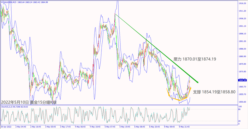 昨天(9日)美元指數再創20年新高,造成黃金價格大跌近30美元。預期今天(10日)美國財長耶倫在金融穩定報告證詞對經濟提出示警,一旦造成美元和美股下跌,推升黃金價格突破小時布林帶上軌線1862美元,建議可短多操作。