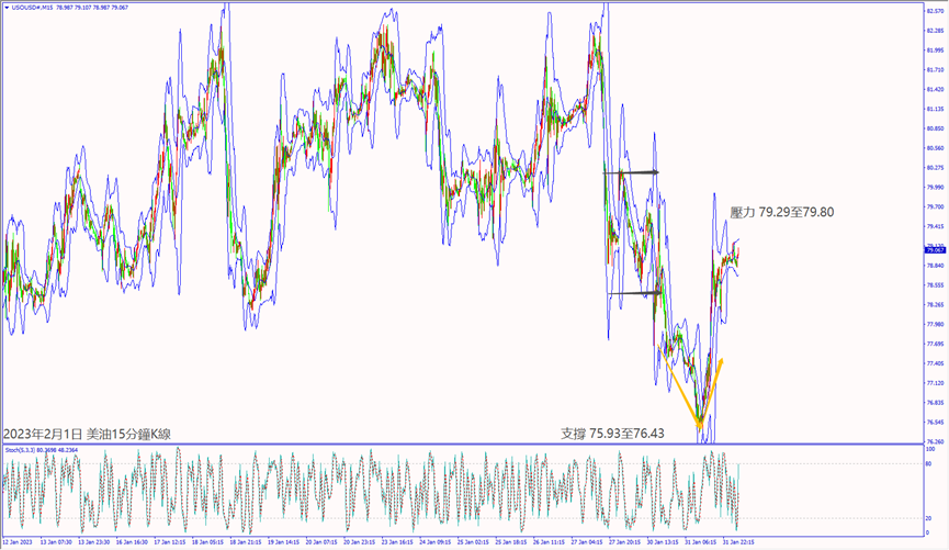 昨天(31日)市場擔憂歐元區經濟數據不佳,一度造成德指下跌約百點,但是德國公佈失業數據下降和歐元區第四季度GDP好於市場預期,帶動德指逆勢漲超1%。晚間美國公佈經濟數據大都不佳利淡加息,道瓊斯和納指因此逆勢上漲近2%。受到歐美股指下跌影響,美油價格一度回落至76.50美元附近盤整。晚間歐美股指逆勢上漲,帶動美油價格反轉漲超3%。週三(1日)清晨美國API原油庫存高於市場預期,造成美油急跌回測78.00關口。