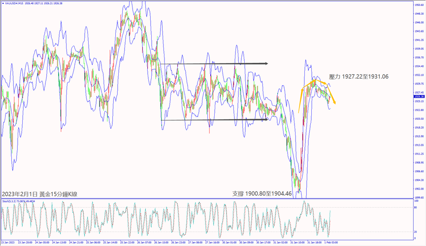 日級別線圖,長下影線紅K,5日均線沖不過,可能再度回測1900.00關口;15分鐘K線,圓弧頂反轉,前波盤整頂部反壓,大有可能回測起漲支撐。