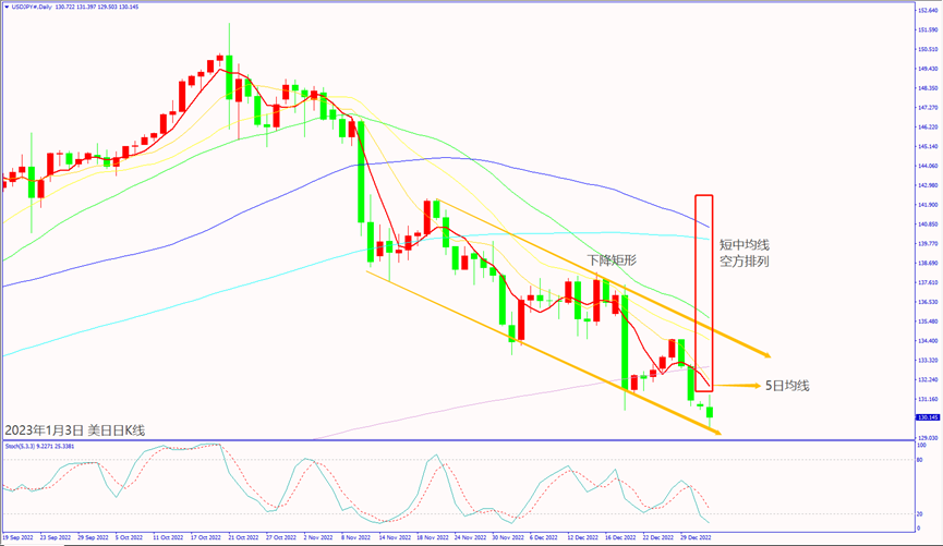 日級別線圖,出現下降矩形空方走勢,5日均線沖不過,可能延續跌勢。