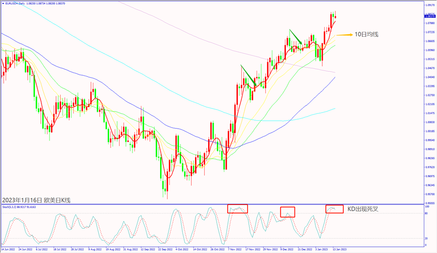日級別線圖,長下影線陰燭,KD出現死叉,可能回測10日均線。