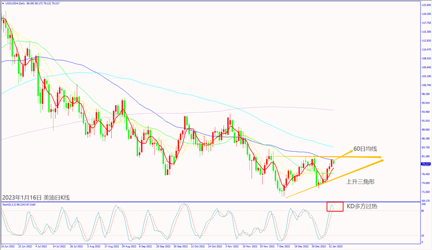 上週一(9日)科威特計畫增加對歐燃油出口,造成美油反轉下跌。上週二(10日) 伊拉克西古爾奈2號油田將於2月1日恢復生產,以及經濟資料利好歐美股指上漲,造成美油價格介於74~76美元之間震盪。上週三(11日)俄烏衝突持續擴大炮火襲擊,以及美國通脹預期持續下降利好美股上漲,帶動美油價格連三陽,累積一周上漲約8%,上週五(20日)尾盤重回80.00關口。
