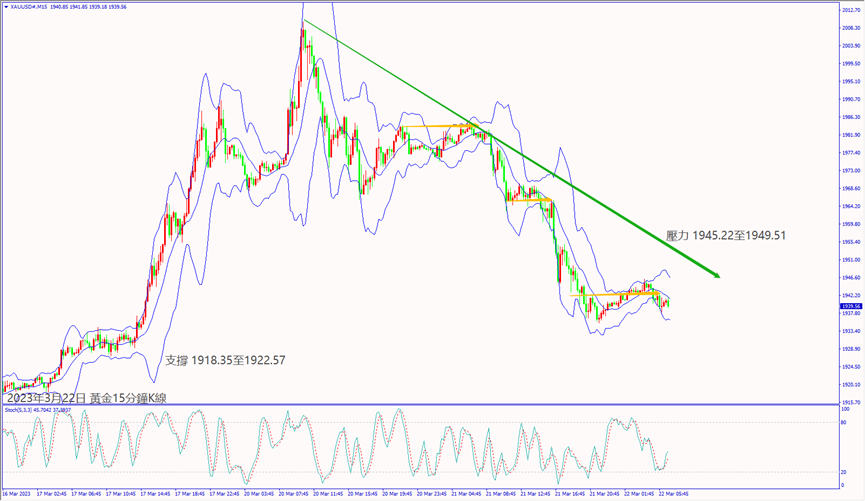 週二(21日)歐洲銀行業管理局表示歡迎瑞士的行動,歐洲銀行業部門具有韌性利好股指反彈,也讓避險資金拋售黃金造成價格下跌。晚間美國財長對銀行信心講話利好美股持續上漲,市場拋售黃金造成價格擴大下跌50美元,尾盤守在1940.00關口附近整理。