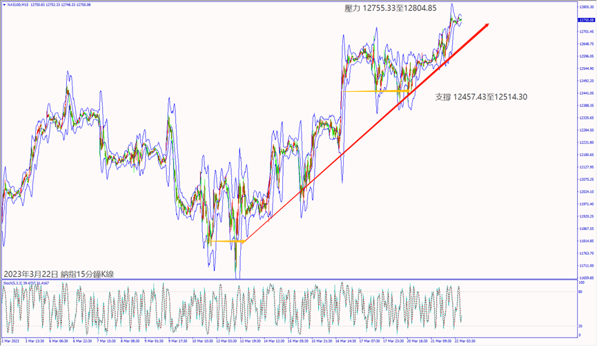 昨天(21日)歐美官員對銀行皆表示有信心,利好歐美股指皆漲超1%。預期今天(22日)英國公佈經濟數據大都不佳利淡股指,德指一旦跌破小時布林帶下軌線15,189,建議可短空操作。預期本週四(23日)清晨美聯儲利率決議宣布加息,納指若摜破小時布林帶中軌12,712,建議可短空操作。